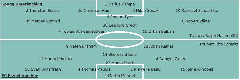 FC Erzgebirge Aue: Martin Männel - René Klingbeil, Pierre le Beau (74. Eric Agyemang), Thomas Paulus, Sven Schaffrath - Daniyel Cimen, Marco Stark (62. Nico Klotz), Skerdilaid Curri, Manuel Hiemer (46. Bashiru Gambo) - Alban Ramaj, Najeh Braham; Trainer: Rico Schmitt