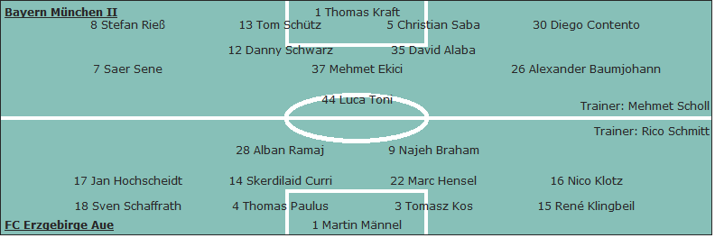 Bayern München II: Thomas Kraft - Stefan Rieß, Tom Schütz, Christian Saba, Diego Contento (46. Taygun Kuru) - Saer Sene (69. Daniel Sikorski), Danny Schwarz, Mehmet Ekici, David Alaba, Alexander Baumjohann - Luca Toni (69. Deniz Yilmaz); Trainer: Mehmet Scholl