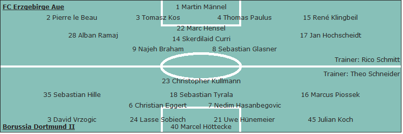 FC Erzgebirge Aue: Martin Männel - Pierre le Beau, Tomasz Kos, Thomas Paulus, René Klingbeil - Alban Ramaj, Marc Hensel, Skerdilaid Curri, Jan Hochscheidt - Najeh Braham (67. Manuel Hiemer), Sebastian Glasner (78. Sven Müller); Trainer: Rico Schmitt