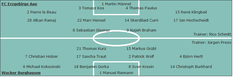 FC Erzgebirge Aue: Martin Männel - Pierre le Beau, Tomasz Kos, Thomas Paulus, René Klingbeil - Alban Ramaj, Marc Hensel, Skerdilaid Curri (78. Sven Müller), Jan Hochscheidt - Sebastian Glasner (68. Eric Agyemang), Najeh Braham (85. Sven Schaffrath); Trainer: Rico Schmitt