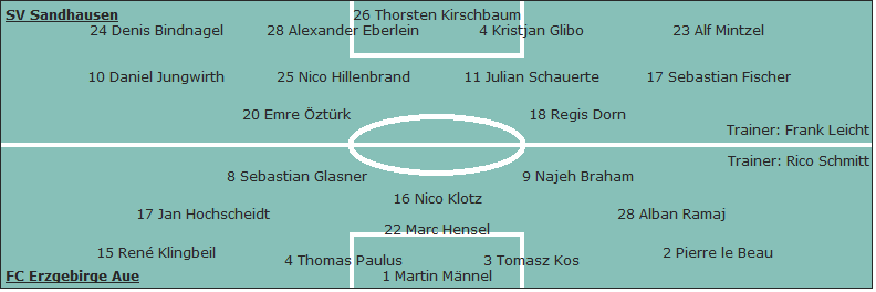 FC Erzgebirge Aue: Martin Männel - Pierre le Beau, Tomasz Kos, Thomas Paulus, René Klingbeil (46. Thomas Birk) - Alban Ramaj, Marc Hensel, Nico Klotz (84. Eric Agyemang), Jan Hochscheidt (52. Sven Müller) - Najeh Braham, Sebastian Glasner; Trainer: Rico Schmitt