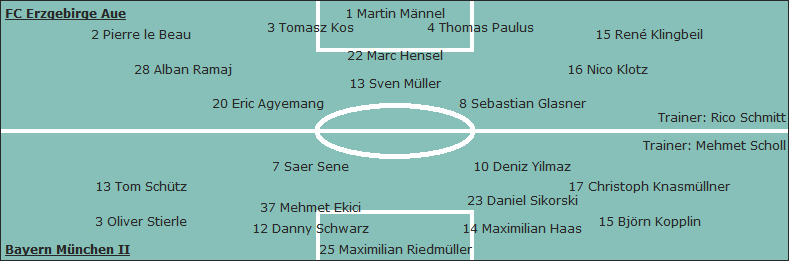 Bayern München II: Maximilian Riedmüller - Björn Kopplin, Maximilian Haas, Danny Schwarz, Oliver Stierle - Christoph Knasmüllner, Daniel Sikorski, Mehmet Ekici, Tom Schütz (68. Nicola Sansone) - Deniz Yilmaz, Saer Sene; Trainer: Mehmet Scholl