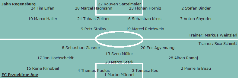 Jahn Regensburg: Rouven Sattelmaier - Tim Erfen, Marcel Hagmann, Florian Hörnig, Stefan Binder - Marco Haller, Tobias Zellner, Sebastian Kreis, Anton Shynder - Petr Stoilov, Marcel Reichwein (89. Jürgen Schmid); Trainer: Markus Weinzierl