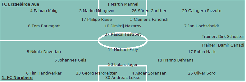 FC Erzgebirge Aue: Martin Männel - Fabian Kalig, Marko Mihojevic, Sören Gonther, Calogero Rizzuto - Philipp Riese, Clemens Fandrich - Tom Baumgart (81. Florian Krüger), Dimitrij Nazarov, Jan Hochscheidt (88. Philipp Zulechner) - Pascal Testroet (90+6. Dennis Kempe); Trainer: Dirk Schuster