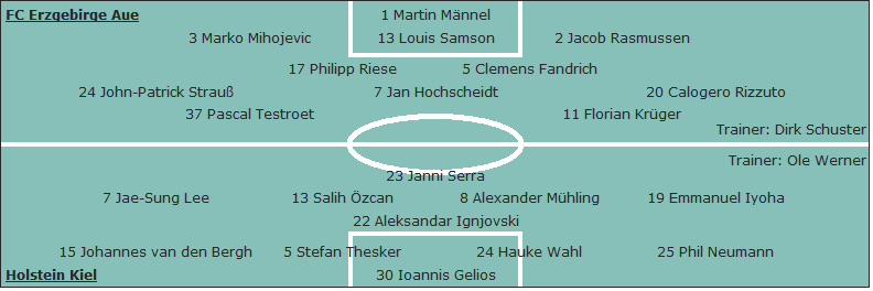 Holstein Kiel: Ioannis Gelios - Phil Neumann (32. Darko Todorovic), Hauke Wahl, Stefan Thesker, Johannes van den Bergh (79. Young-Jae Seo) - Aleksandar Ignjovski - Emmanuel Iyoha, Alexander Mühling, Salih Özcan, Jae-Sung Lee - Janni Serra (66. Finn Porath); Trainer: Ole Werner