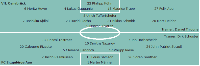 VfL Osnabrück: Phillipp Kühn - Moritz Heyer, Lukas Gugganig (61. Anas Ouahim), Maurice Trapp, Felix Agu - Ulrich Taffertshofer (76. Benjamin Girth) - Bashkim Ajdini, David Blacha, Niklas Schmidt, Marc Heider - Marcos Alvarez; Trainer: Daniel Thioune