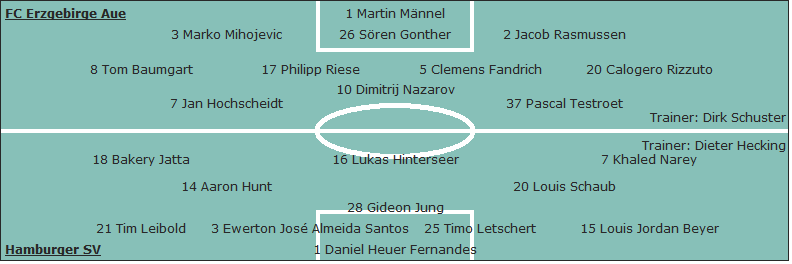 FC Erzgebirge Aue: Martin Männel - Marko Mihojevic, Sören Gonther, Jacob Rasmussen - Tom Baumgart (46. John-Patrick Strauß), Philipp Riese, Clemens Fandrich, Calogero Rizzuto - Dimitrij Nazarov (76. Florian Krüger) - Jan Hochscheidt, Pascal Testroet (84. Christoph Daferner); Trainer: Dirk Schuster