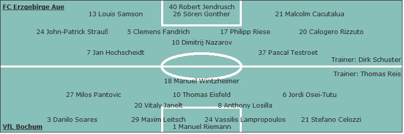 VfL Bochum: Manuel Riemann - Stefano Celozzi (81. Cristian Gamboa), Vassilis Lampropoulos, Maxim Leitsch, Danilo Soares - Anthony Losilla, Vitaly Janelt (75. Robert Tesche) - Jordi Osei-Tutu (71. Tom Weilandt), Thomas Eisfeld (71. Robert Zulj), Milos Pantovic - Manuel Wintzheimer; Trainer: Thomas Reis