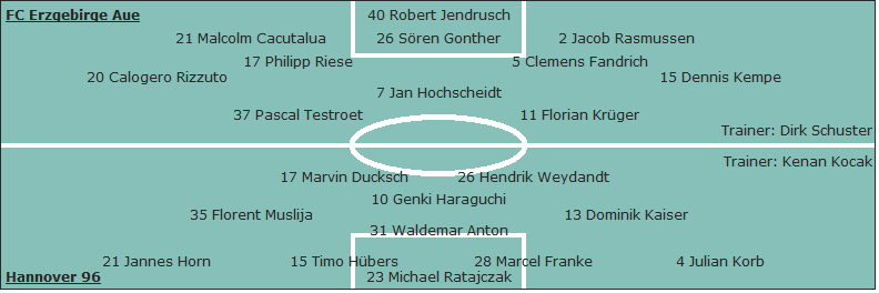 FC Erzgebirge Aue: Robert Jendrusch - Malcolm Cacutalua, Sören Gonther, Jacob Rasmussen - Calogero Rizzuto (31. Tom Baumgart), Philipp Riese, Clemens Fandrich, Dennis Kempe - Jan Hochscheidt (31. John-Patrick Strauß) - Pascal Testroet (78. Philipp Zulechner), Florian Krüger (90. Njegos Kupusovic); Trainer: Dirk Schuster