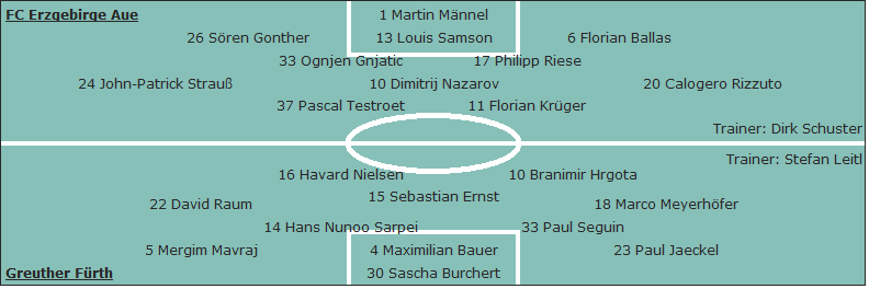 FC Erzgebirge Aue: Martin Männel - Sören Gonther, Louis Samson, Florian Ballas - Ognjen Gnjatic (83. Malcolm Cacutalua), Philipp Riese - John-Patrick Strauß, Dimitrij Nazarov (60. Jan Hochscheidt), Calogero Rizzuto - Pascal Testroet (83. Philipp Zulechner), Florian Krüger; Trainer: Dirk Schuster