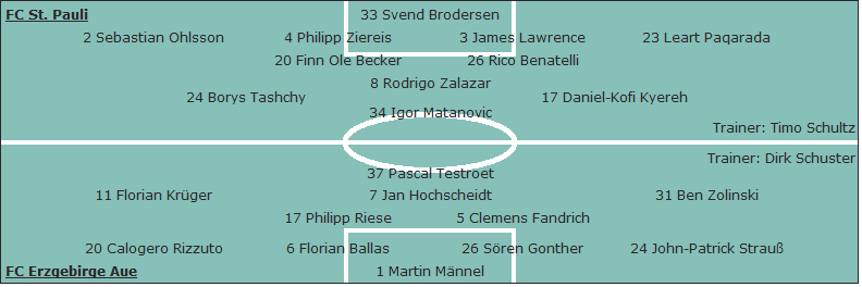 FC St. Pauli: Svend Brodersen - Sebastian Ohlsson (80. Maximilian Dittgen), Philipp Ziereis (15. Daniel Buballa), James Lawrence, Leart Paqarada - Finn Ole Becker, Rico Benatelli - Rodrigo Zalazar (80. Marvin Knoll), Borys Tashchy (63. Lukas Daschner), Daniel-Kofi Kyereh (80. Simon Makienok) - Igor Matanovic; Trainer: Timo Schultz