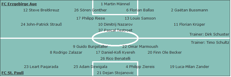 FC St. Pauli: Dejan Stojanovic - Luca-Milan Zander, Philipp Ziereis, Adam Dzwigala, Leart Paqarada - Rico Benatelli (67. Afeez Aremu) - Finn Ole Becker (67. Lukas Daschner), Daniel-Kofi Kyereh (89. Igor Matanovic), Rodrigo Zalazar - Omar Marmoush (67. Maximilian Dittgen), Guido Burgstaller (83. Tore Reginiussen); Trainer: Timo Schultz