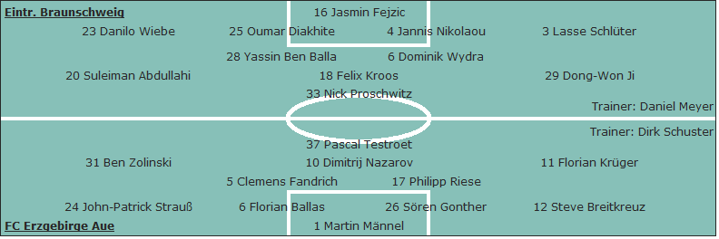 Eintr. Braunschweig: Jasmin Fejzic - Danilo Wiebe, Oumar Diakhite, Jannis Nikolaou, Lasse Schlüter - Yassin Ben Balla (72. Martin Kobylanski), Dominik Wydra (60. Patrick Kammerbauer) - Suleiman Abdullahi (72. Marcel Bär), Felix Kroos, Dong-Won Ji (60. Fabio Kaufmann) - Nick Proschwitz; Trainer: Daniel Meyer