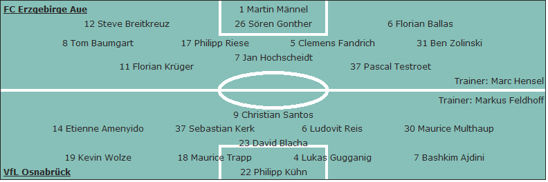 VfL Osnabrück: Philipp Kühn - Bashkim Ajdini, Lukas Gugganig, Maurice Trapp, Kevin Wolze - David Blacha (78. Bryan Henning) - Maurice Multhaup (69. Marc Heider), Ludovit Reis, Sebastian Kerk (75. Niklas Schmidt), Etienne Amenyido (78. Sebastian Müller) - Christian Santos; Trainer: Markus Feldhoff