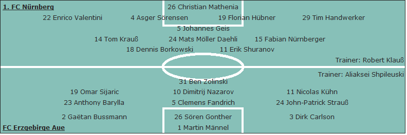 1. FC Nürnberg: Christian Mathenia - Enrico Valentini, Asger Sörensen, Florian Hübner, Tim Handwerker - Johannes Geis - Tom Krauß (90+1. Taylan Duman), Mats Möller Daehli, Fabian Nürnberger (59. Robin Hack) - Dennis Borkowski (76. Nikola Dovedan), Erik Shuranov (59. Manuel Schäffler); Trainer: Robert Klauß
