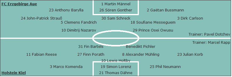 Holstein Kiel: Thomas Dähne - Phil Neumann, Simon Lorenz, Marco Komenda (78. Johannes van den Bergh) - Lewis Holtby - Julian Korb, Alexander Mühling, Finn Porath (61. Philipp Sander), Fabian Reese (78. Jonas Sterner) - Benedikt Pichler (69. Kwasi Okyere Wriedt), Fin Bartels (69. Steven Skrzybski); Trainer: Marcel Rapp