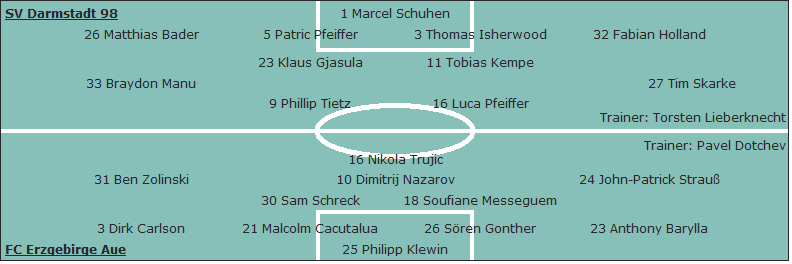 SV Darmstadt 98: Marcel Schuhen - Matthias Bader, Patric Pfeiffer, Thomas Isherwood, Fabian Holland - Klaus Gjasula (84. Jannik Müller), Tobias Kempe - Braydon Manu (61. Mathias Honsak), Tim Skarke (68. Frank Ronstadt) - Phillip Tietz (68. Marvin Mehlem), Luca Pfeiffer (84. Emir Karic); Trainer: Torsten Lieberknecht