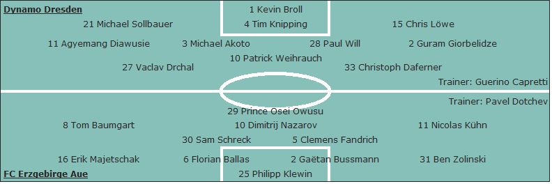 Dynamo Dresden: Kevin Broll - Michael Sollbauer (85. Yannick Stark), Tim Knipping, Chris Löwe - Agyemang Diawusie (70. Morris Schröter), Michael Akoto, Paul Will (85. Oliver Batista Meier), Guram Giorbelidze (85. Brandon Borrello) - Patrick Weihrauch - Vaclav Drchal (70. Panagiotis Vlachodimos), Christoph Daferner; Trainer: Guerino Capretti
