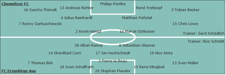 Chemnitzer FC: Philipp Pentke - Andreas Richter, René Trehkopf, Sascha Thönelt, Tobias Becker - Julius Reinhardt, Matthias Peßolat (64. Jörg Emmerich), Ronny Garbuschewski, Chris Löwe (86. Jörn Nowak) - Kevin Hampf, Marcel Schlosser (90+2. Steffen Kellig); Trainer: Gerd Schädlich