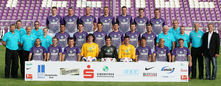 Mitte v.l: Teamarzt Torsten Seltmann, Masseur Jens Borchert, Gunter Leichsenring, Physiotherapeut Friedrich Ramminger, Teamärztin Eva Marcus, Halil Savran, Nicolas Höfler, Vlad Munteanu, Kevin Schlitte, Ronald Gercaliu, René Klingbeil, Mannschaftsverantwortlicher Bernd Zimmermann, Torwart-Trainer Russi Petkov, Co-Trainer Marco Kämpfe, Cheftrainer Karsten Baumann, Sportdirektor Steffen Heidrich