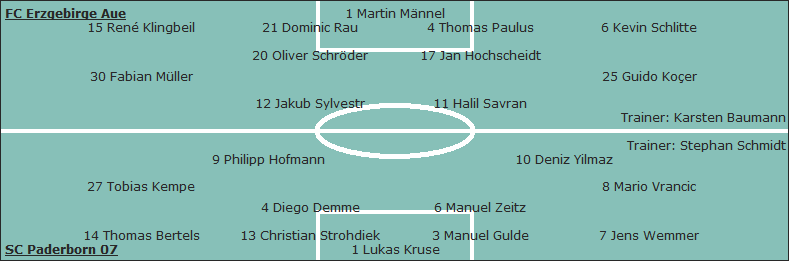FC Erzgebirge Aue: Martin Männel - René Klingbeil (68. Marc Hensel), Dominic Rau, Thomas Paulus, Kevin Schlitte - Fabian Müller, Oliver Schröder, Jan Hochscheidt, Guido Koçer (56. Vlad Munteanu) - Jakub Sylvestr, Halil Savran (53. Ronny König); Trainer: Karsten Baumann