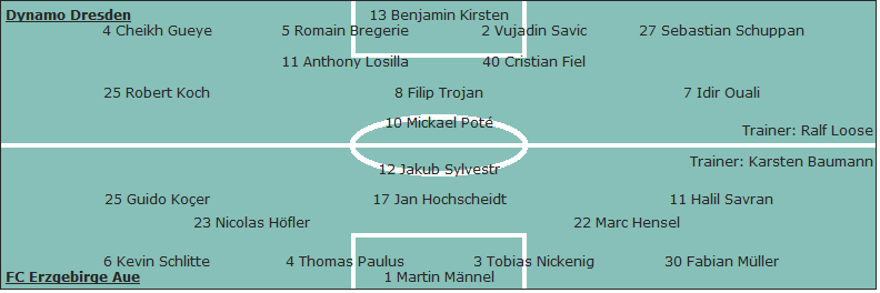 Dynamo Dresden: Benjamin Kirsten - Cheikh Gueye, Romain Bregerie, Vujadin Savic, Sebastian Schuppan - Robert Koch, Anthony Losilla, Filip Trojan (75. Tobias Jänicke), Cristian Fiel, Idir Ouali (68. Lynel Kitambala) - Mickael Poté (90. Petar Sliskovic); Trainer: Ralf Loose
