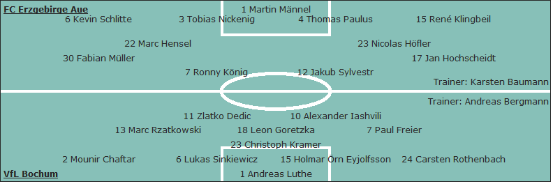 VfL Bochum: Andreas Luthe (13. Philipp Heerwagen) - Carsten Rothenbach, Holmar Örn Eyjolfsson, Lukas Sinkiewicz, Mounir Chaftar - Paul Freier, Christoph Kramer, Leon Goretzka, Marc Rzatkowski (46. Yusuke Tasaka) - Alexander Iashvili (55. Jonas Acquistapace), Zlatko Dedic; Trainer: Andreas Bergmann