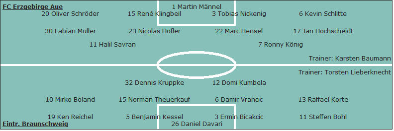 FC Erzgebirge Aue: Martin Männel - Oliver Schröder, René Klingbeil, Tobias Nickenig, Kevin Schlitte - Fabian Müller, Nicolas Höfler, Marc Hensel, Jan Hochscheidt - Halil Savran (65. Andreas Wiegel), Ronny König; Trainer: Karsten Baumann