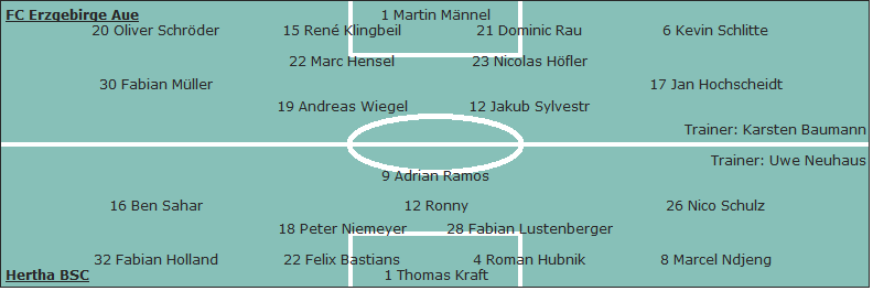 Hertha BSC: Thomas Kraft - Marcel Ndjeng, Roman Hubnik, Felix Bastians, Fabian Holland - Nico Schulz (70. Sami Allagui), Fabian Lustenberger, Ronny (63. Hany Mukhtar), Peter Niemeyer, Ben Sahar - Adrian Ramos (67. Sandro Wagner); Trainer: Uwe Neuhaus