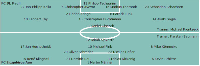 FC St. Pauli: Philipp Tschauner - Jan-Philipp Kalla, Christopher Avevor, Markus Thorandt, Sebastian Schachten - Lennart Thy (66. Mahir Saglik), Florian Kringe (79. Dennis Daube), Christopher Buchtmann, Patrick Funk, Akaki Gogia (79. Marius Ebbers) - Daniel Ginczek; Trainer: Michael Frontzeck
