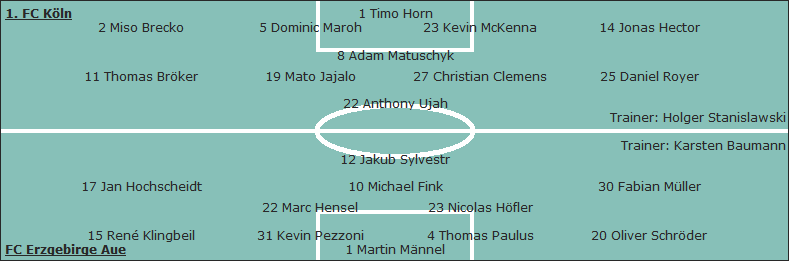 1. FC Köln: Timo Horn - Miso Brecko, Dominic Maroh, Kevin McKenna, Jonas Hector - Thomas Bröker, Mato Jajalo (69. Matthias Lehmann), Adam Matuschyk, Christian Clemens, Daniel Royer (69. Stefan Maierhofer) - Anthony Ujah; Trainer: Holger Stanislawski