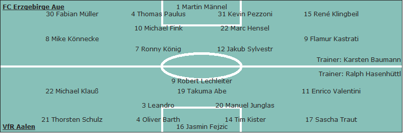 VfR Aalen: Jasmin Fejzic - Sascha Traut, Tim Kister, Oliver Barth, Thorsten Schulz - Enrico Valentini, Manuel Junglas (72. Andreas Hofmann), Takuma Abe (90+1. Jürgen Mössmer), Leandro, Michael Klauß - Robert Lechleiter (90+4. Cidimar); Trainer: Ralph Hasenhüttl