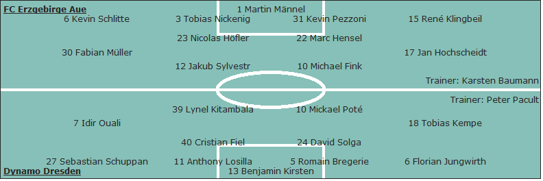 FC Erzgebirge Aue: Martin Männel - Kevin Schlitte, Tobias Nickenig, Kevin Pezzoni, René Klingbeil - Fabian Müller (86. Mike Könnecke), Nicolas Höfler, Marc Hensel, Jan Hochscheidt (78. Halil Savran) - Jakub Sylvestr, Michael Fink (67. Andreas Wiegel); Trainer: Karsten Baumann