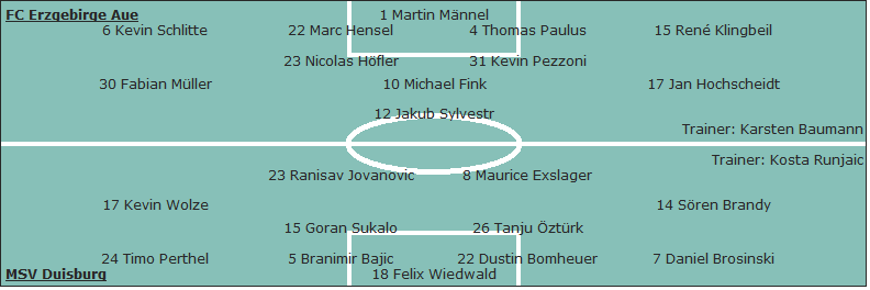 FC Erzgebirge Aue: Martin Männel - Kevin Schlitte, Marc Hensel, Thomas Paulus (79. Guido Koçer), René Klingbeil - Fabian Müller, Nicolas Höfler, Michael Fink (73. Flamur Kastrati), Kevin Pezzoni, Jan Hochscheidt - Jakub Sylvestr (90. Ronny König); Trainer: Karsten Baumann
