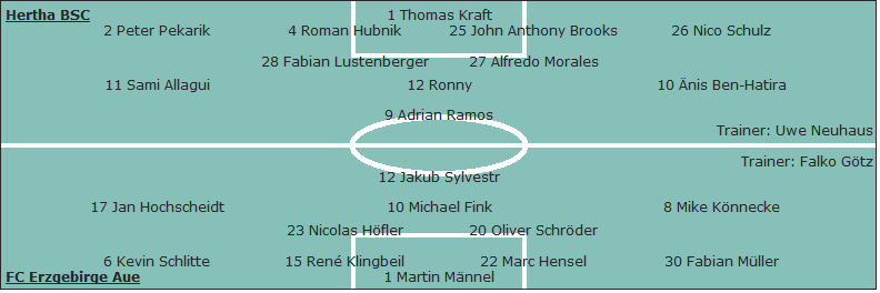 Hertha BSC: Thomas Kraft - Peter Pekarik, Roman Hubnik, John Anthony Brooks, Nico Schulz - Sami Allagui, Fabian Lustenberger, Ronny (84. Sandro Wagner), Alfredo Morales, Änis Ben-Hatira (70. Ben Sahar) - Adrian Ramos (46. Pierre-Michel Lasogga); Trainer: Uwe Neuhaus