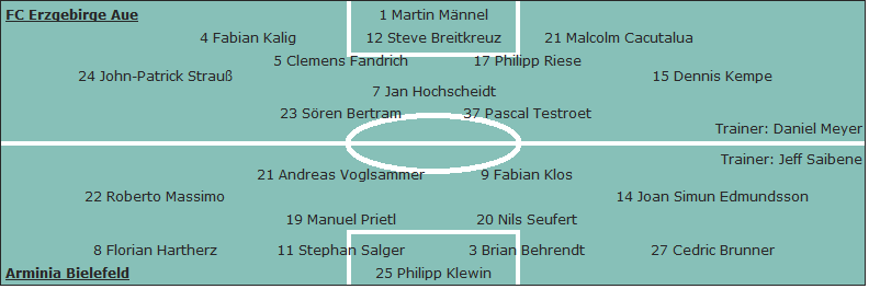 FC Erzgebirge Aue: Martin Männel - Fabian Kalig, Steve Breitkreuz, Malcolm Cacutalua - John-Patrick Strauß, Clemens Fandrich, Jan Hochscheidt (76. Mario Kvesic), Philipp Riese, Dennis Kempe - Sören Bertram (59. Emmanuel Iyoha), Pascal Testroet (66. Dimitrij Nazarov); Trainer: Daniel Meyer