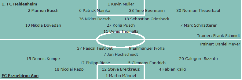 1. FC Heidenheim: Kevin Müller - Marnon Busch (79. Patrick Schmidt), Patrick Mainka, Timo Beermann, Norman Theuerkauf - Nikola Dovedan (83. Arne Feick), Niklas Dorsch, Kolja Pusch (64. Maurice Multhaup), Sebastian Griesbeck, Marc Schnatterer - Denis Thomalla; Trainer: Frank Schmidt