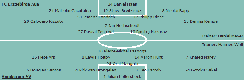 FC Erzgebirge Aue: Daniel Haas - Malcolm Cacutalua, Steve Breitkreuz, Nicolai Rapp - Calogero Rizzuto (72. Mario Kvesic), Clemens Fandrich (76. Sören Bertram), Jan Hochscheidt, Philipp Riese, Dennis Kempe - Pascal Testroet (72. Robert Herrmann), Dimitrij Nazarov; Trainer: Daniel Meyer