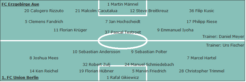 1. FC Union Berlin: Rafal Gikiewicz - Christopher Trimmel, Marvin Friedrich, Florian Hübner, Ken Reichel - Marcel Hartel (70. Akaki Gogia), Manuel Schmiedebach, Robert Zulj (61. Felix Kroos), Joshua Mees (61. Suleiman Abdullahi) - Sebastian Polter, Sebastian Andersson; Trainer: Urs Fischer