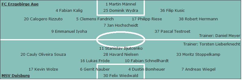 FC Erzgebirge Aue: Martin Männel - Fabian Kalig, Dominik Wydra, Filip Kusic - Calogero Rizzuto, Clemens Fandrich, Jan Hochscheidt, Philipp Riese, Robert Herrmann (74. Tom Baumgart) - Emmanuel Iyoha (74. Florian Krüger), Pascal Testroet (80. Dimitrij Nazarov); Trainer: Daniel Meyer