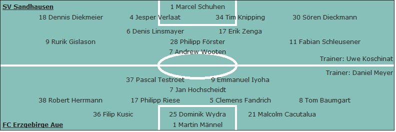 SV Sandhausen: Marcel Schuhen - Dennis Diekmeier, Jesper Verlaat, Tim Knipping, Sören Dieckmann (46. Korbinian Vollmann) - Rurik Gislason, Denis Linsmayer, Philipp Förster, Erik Zenga (82. Markus Karl), Fabian Schleusener (46. Kevin Behrens) - Andrew Wooten; Trainer: Uwe Koschinat