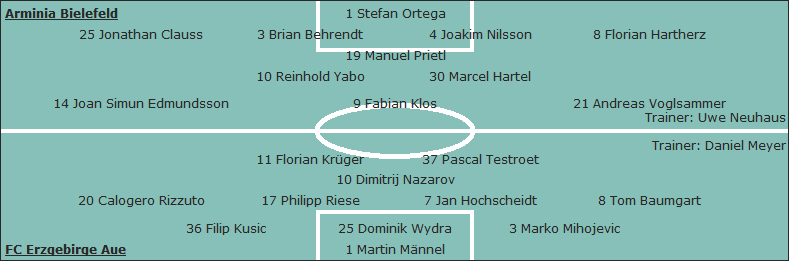FC Erzgebirge Aue: Martin Männel - Marko Mihojevic, Dominik Wydra (81. Hikmet Ciftci), Filip Kusic - Tom Baumgart, Jan Hochscheidt, Philipp Riese, Calogero Rizzuto - Dimitrij Nazarov - Pascal Testroet (67. Christoph Daferner), Florian Krüger (72. Philipp Zulechner); Trainer: Daniel Meyer