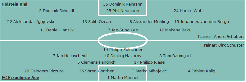 Holstein Kiel: Dominik Reimann - Dominik Schmidt, Phil Neumann, Hauke Wahl - Aleksandar Ignjovski, Salih Özcan, Alexander Mühling (29. Stefan Thesker), Johannes van den Bergh (55. Emmanuel Iyoha) - Daniel Hanslik (82. David Atanga), Jae-Sung Lee, Makana Baku; Trainer: Andre Schubert