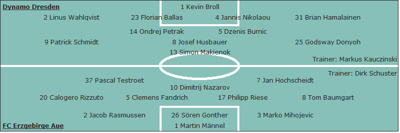 Dynamo Dresden: Kevin Broll - Linus Wahlqvist (46. Niklas Kreuzer), Florian Ballas, Jannis Nikolaou, Brian Hamalainen (84. Chris Löwe) - Ondrej Petrak, Dzenis Burnic - Patrick Schmidt, Josef Husbauer, Godsway Donyoh (90+3. Marco Hartmann) - Simon Makienok; Trainer: Markus Kauczinski