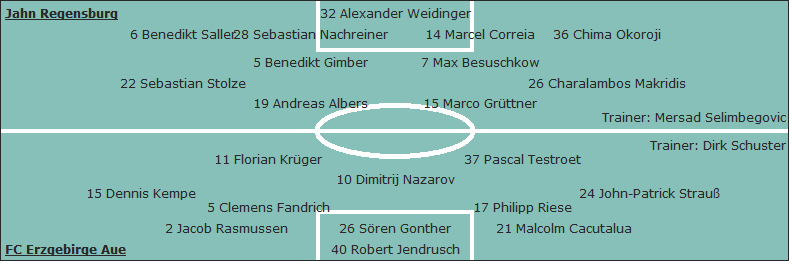 Jahn Regensburg: Alexander Weidinger - Benedikt Saller, Sebastian Nachreiner (67. Andreas Geipl), Marcel Correia (90+1. Tim Knipping), Chima Okoroji - Benedikt Gimber, Max Besuschkow (90+1. Julian Derstroff) - Sebastian Stolze, Charalambos Makridis (83. Aaron Seydel) - Andreas Albers, Marco Grüttner (84. Erik Wekesser); Trainer: Mersad Selimbegovic